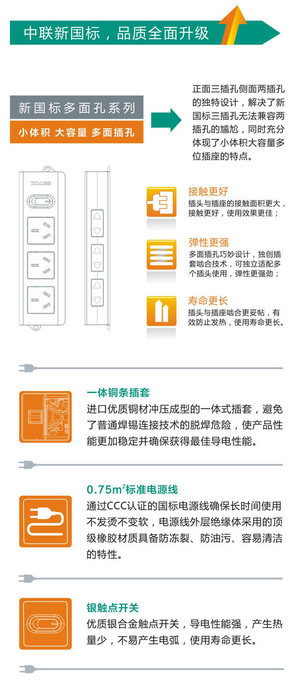 中聯(lián)國標(biāo)多面孔系列插座正面三插孔側(cè)面兩插孔的獨特設(shè)計,解決了新國標(biāo)三插孔無法兼容兩插孔的尷尬,同時充分體現(xiàn)了小體積大容量多位插座的特點。